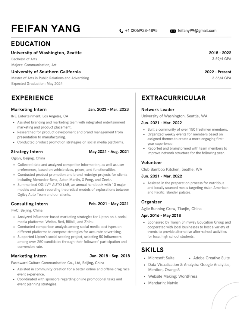 Currently a Master of Public Relations and Advertising student at USC, I graduated with a Bachelor of Arts in 2022 from the University of Washington in Communication and Art. I am well-versed in storytelling, market research, and product strategy.